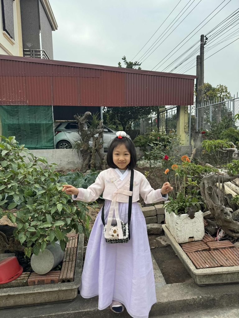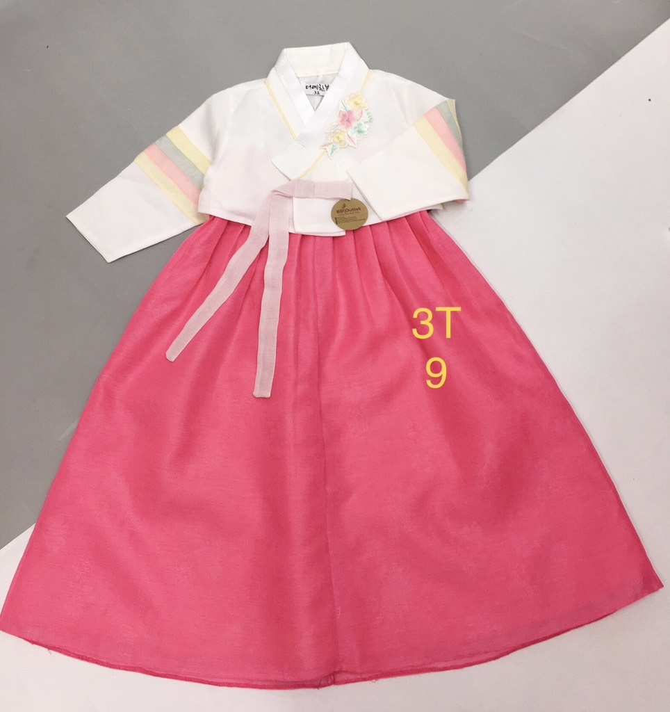 Hanbok xuất Hàn Made in Vietnam xuất khẩu xịn. Toàn bộ phối màu là may đáp nối vải, không phải hàng in màu rẻ tiền. Hình thêu nổi sắc nét.