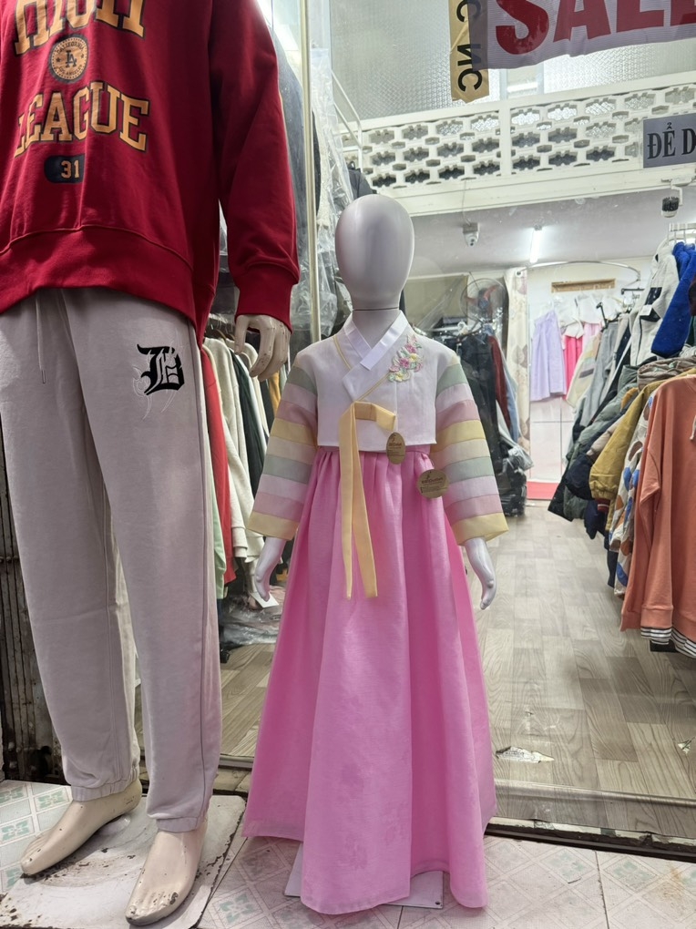 Hanbok xuất Hàn Made in Vietnam xuất khẩu xịn. Toàn bộ phối màu là may đáp nối vải, không phải hàng in màu rẻ tiền. Hình thêu nổi sắc nét.